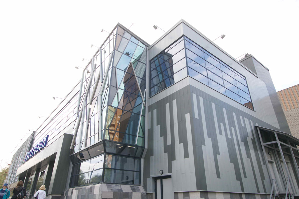 Интересный и красивый проект отделки фасада панелями из цинк-титана RHEINZINK реализован в Ижевске на объекте Торговый центр Океан (2008-09 г.г., компания Юникон). Применялся материал темно-серого и серо-голубого оттенков в панелях 28 типоразмеров. В результате, в сочетании с оригинальным остеклением и конструкциями витражей, различающихся по цвету, форме и размерам, фасад играет, как поверхность моря.